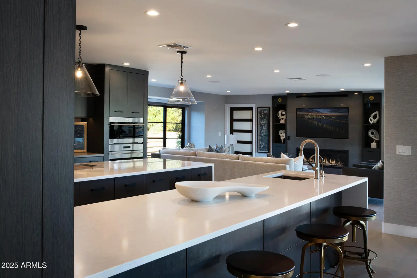 Frank Lloyd Wright inspired home built by Salcito and extensively remodeled to today's modern design and lifestyle. All on one floor except upstairs media/guest room. The gourmet kitchen is the hub to the home's open floor plan overlooking the great room, formal dining and outdoor patio with sparkling pool. Spectacular features and the finest finishes throughout including white washed oak floors, quartz counters, see through fireplace, extravagant Primary suite with spa like bath, black iron light fixtures, fire pit & BBQ. Desert Highlands amenities include Jack Nicklaus signature golf course, 13 tennis courts (4 grass), pickle ball courts, bocce ball courts, fitness center, fine & casual dining,walking paths, guard gated & security patrolled. Buyer to pay $1.9K membership fee at closing.