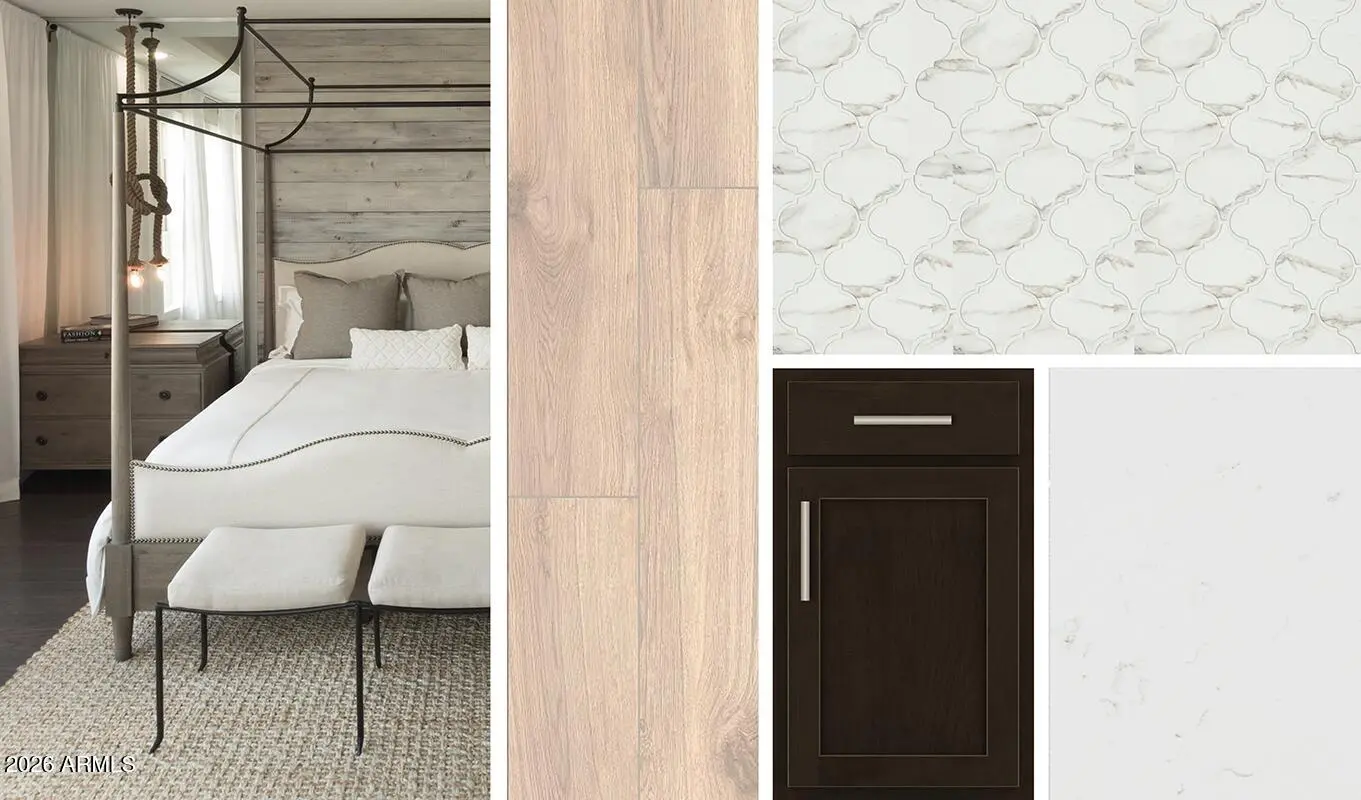 Brand new community in Surprise! This stunning single story home offers 1,567 sq ft of functional living space. It features 3 bedrooms, 2 bathrooms, and a 2-car garage. The open concept kitchen is perfect for entertaining and features an Island, a walk-in pantry and stainless steel appliances. It also offers our Roosevelt Collection which includes 42'' expresso cabinets, ivory biancone quartz kitchen countertops, mosaic carrara tile kitchen backsplash, and 8x36 wood looking plank tile in all the common areas. The great room offers a 4-panel center sliding glass door so you can step out into your covered patio to enjoy indoor/outdoor living in your backyard with friends and family. The primary suite has a spacious walk-in closet, double sinks, walk-in shower, and an additional linen