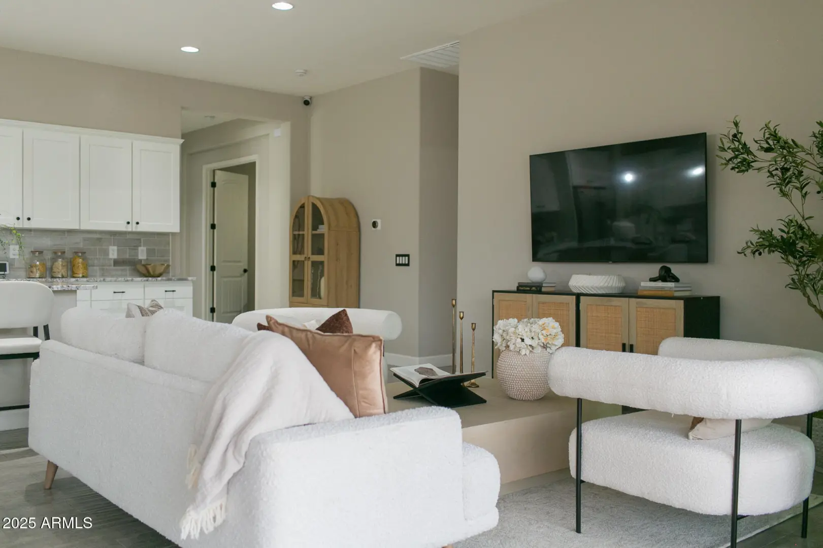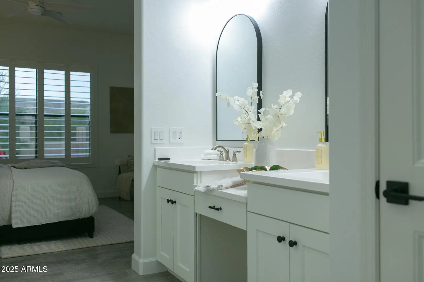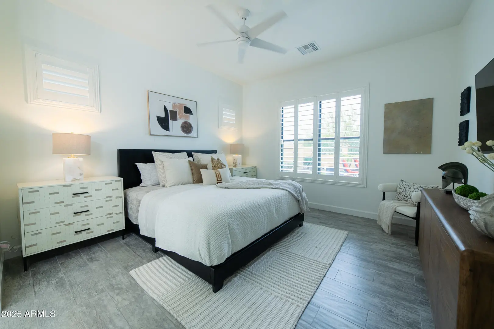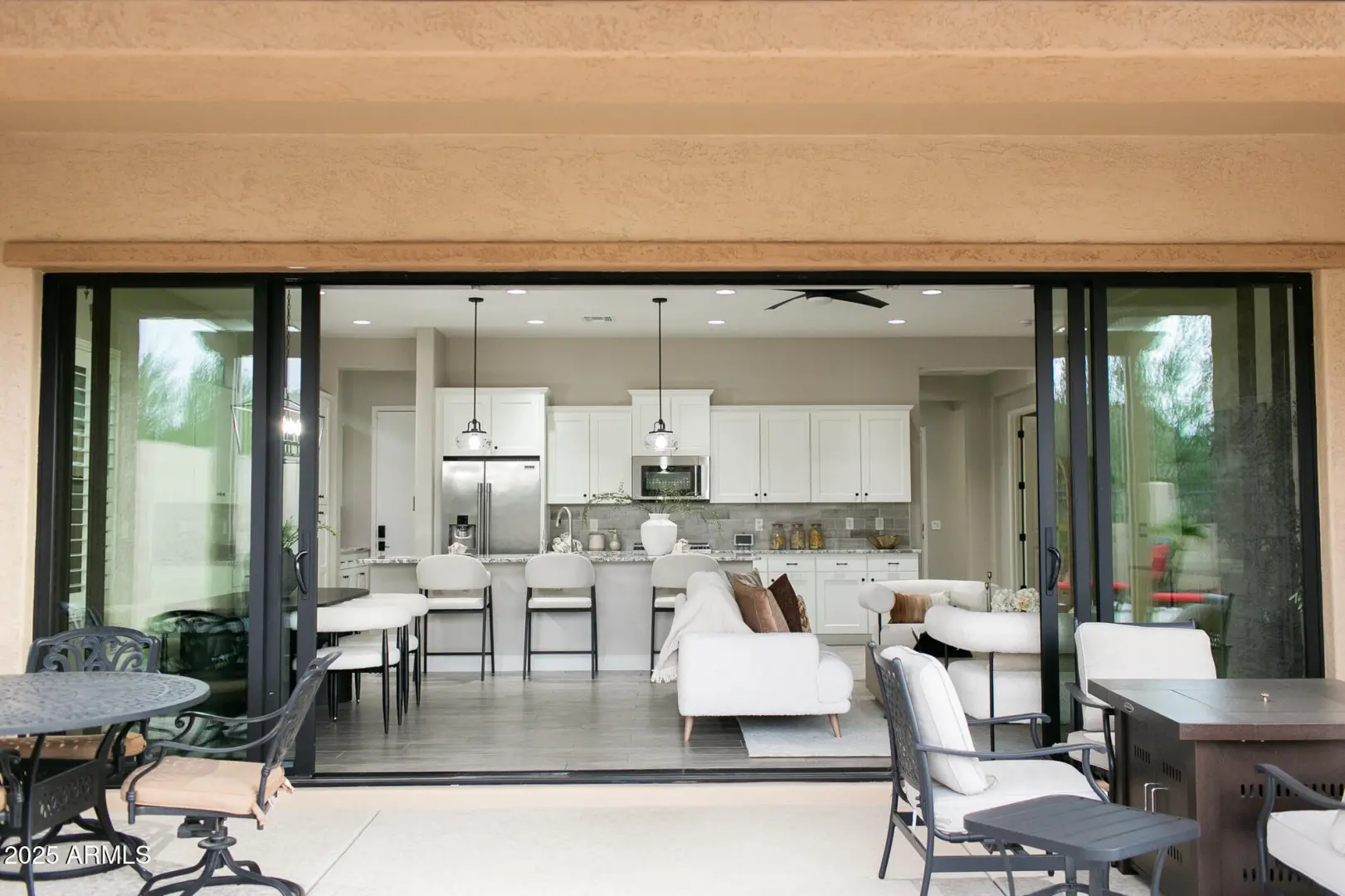 Discover the heart of Mountain Bridge living in this beautifully updated 2-bed + den, 2.5bath home with a sparkling pool, perfectly tucked inside the gated Sanctuary at Mountain Bridge. This community is known for its resort-style amenities, stunning desert backdrop, and true lock-and-leave convenience. Residents enjoy access to the Mountain Bridge Owners' Club with a clubhouse, fitness center, heated pool, spa, pickleball, tennis, and miles of scenic walking paths—creating a lifestyle that feels like a vacation every day. Inside, the home features an inviting front courtyard with gated entry, opening to a bright, open-concept floor plan with high ceilings and abundant natural light. The spacious kitchen offers stainless steel appliances, an island, and generous cabinetry