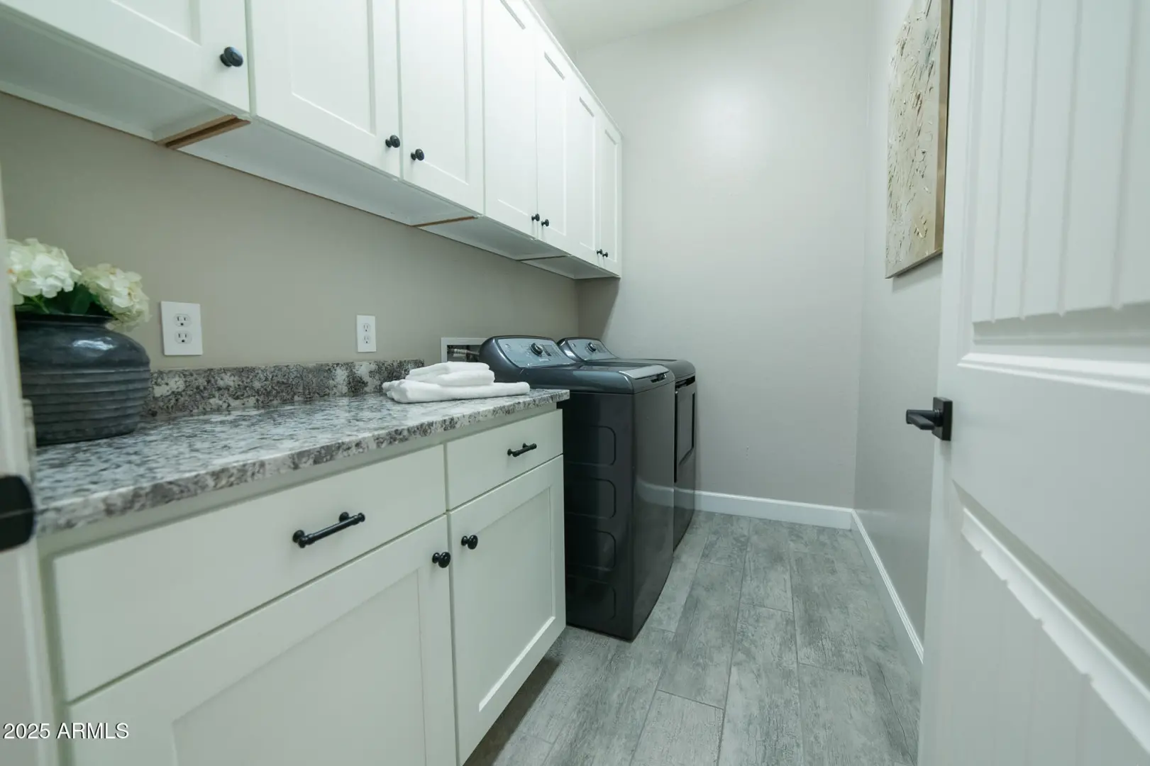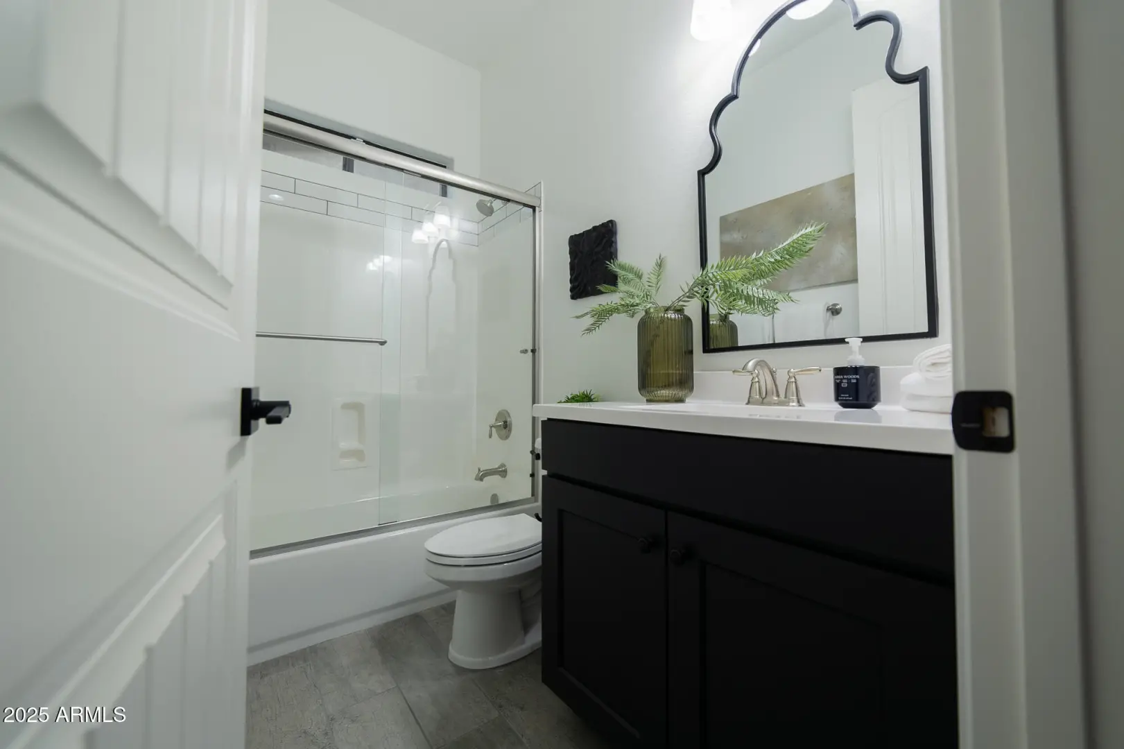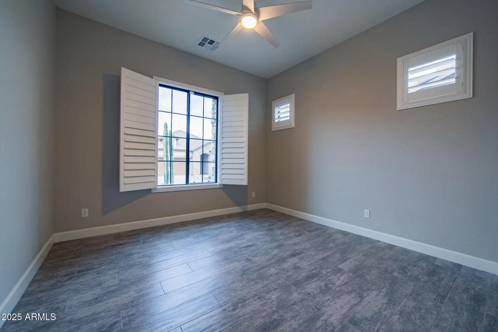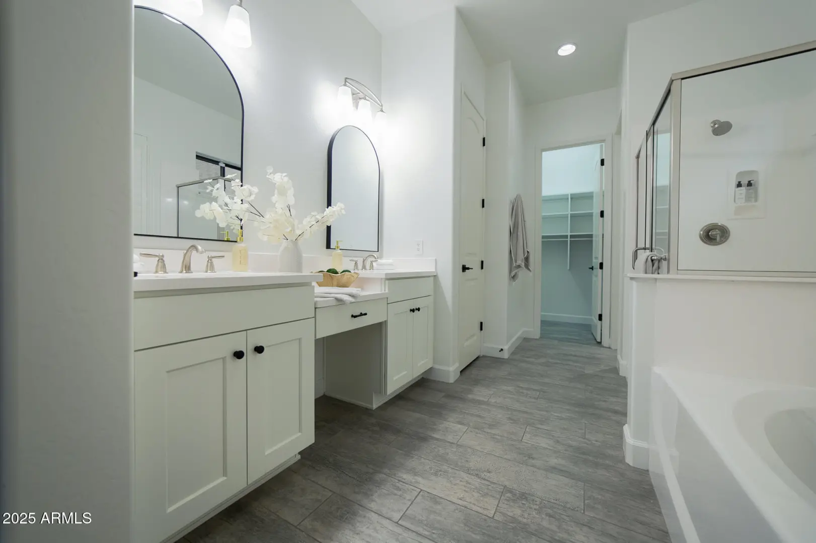 Discover the heart of Mountain Bridge living in this beautifully updated 2-bed + den, 2.5bath home with a sparkling pool, perfectly tucked inside the gated Sanctuary at Mountain Bridge. This community is known for its resort-style amenities, stunning desert backdrop, and true lock-and-leave convenience. Residents enjoy access to the Mountain Bridge Owners' Club with a clubhouse, fitness center, heated pool, spa, pickleball, tennis, and miles of scenic walking paths—creating a lifestyle that feels like a vacation every day. Inside, the home features an inviting front courtyard with gated entry, opening to a bright, open-concept floor plan with high ceilings and abundant natural light. The spacious kitchen offers stainless steel appliances, an island, and generous cabinetry