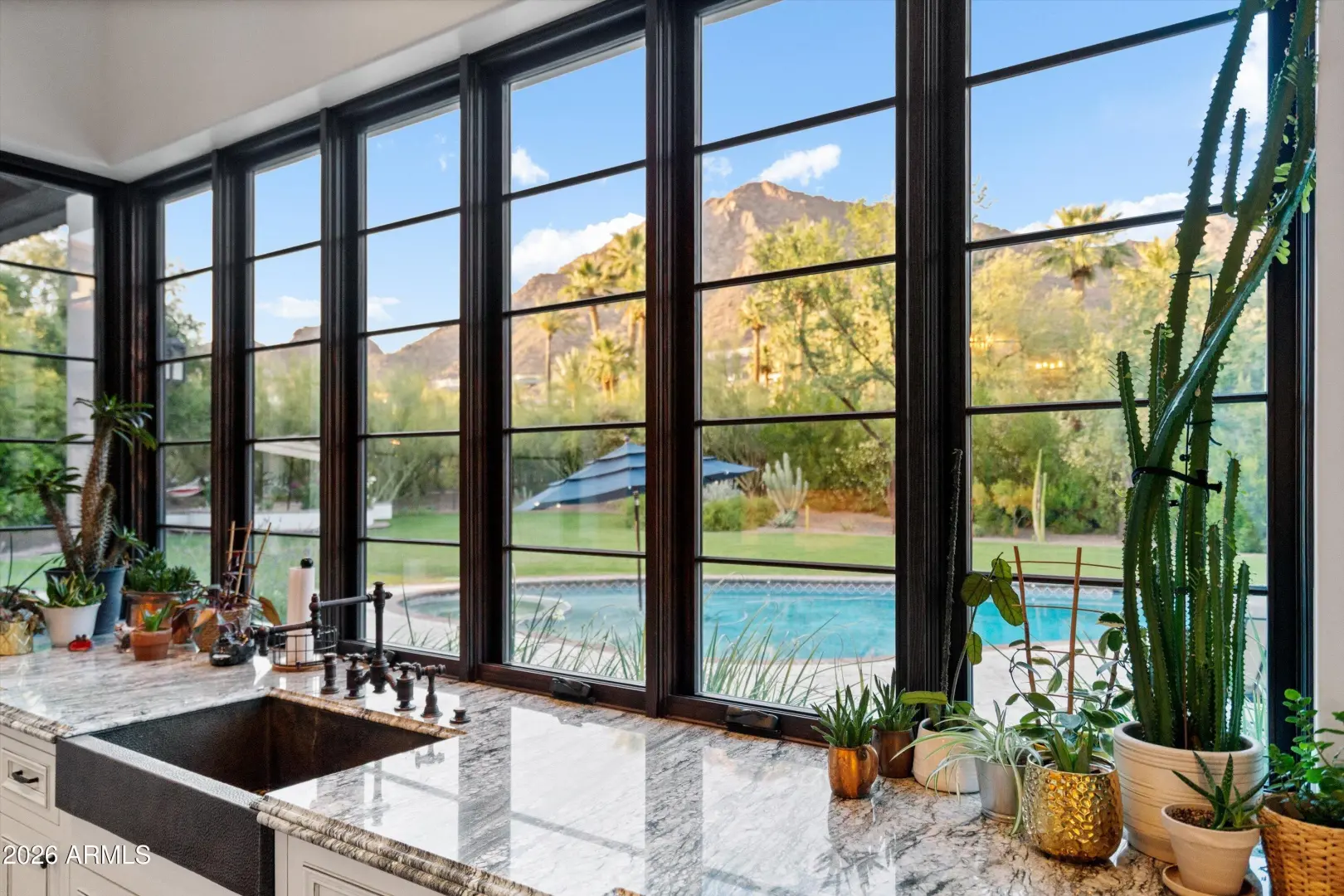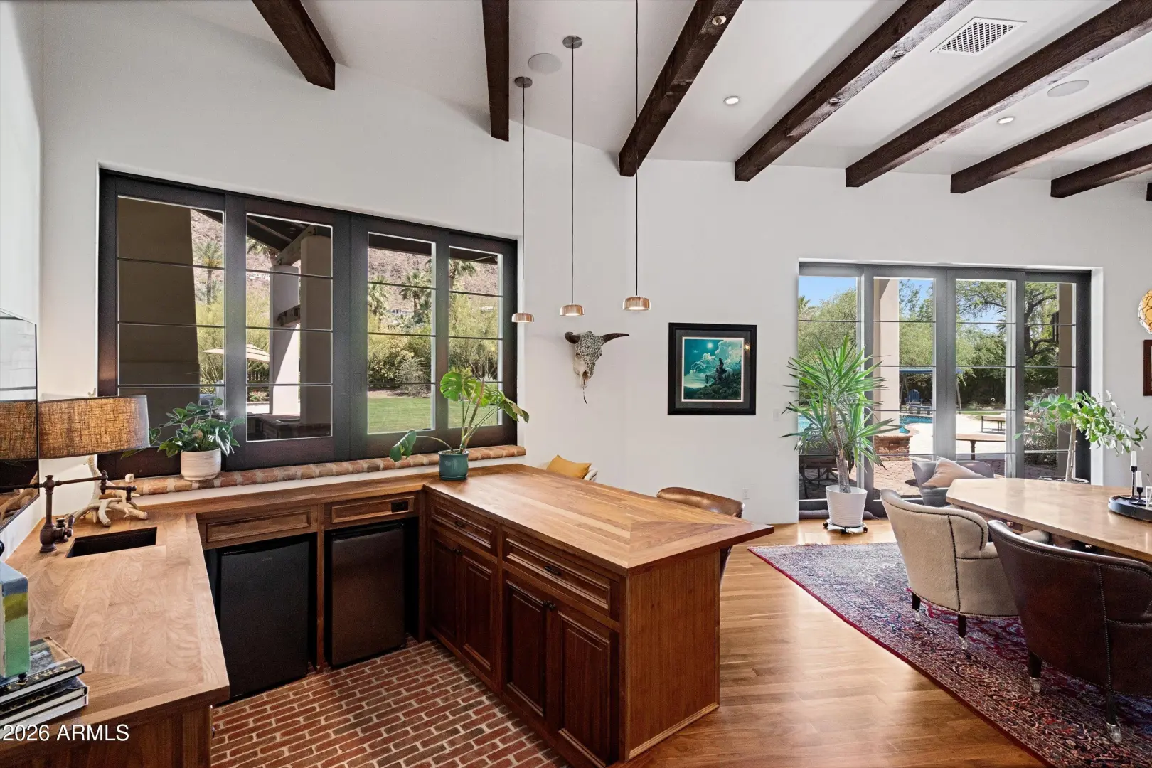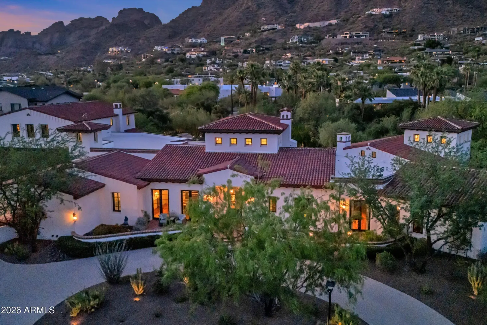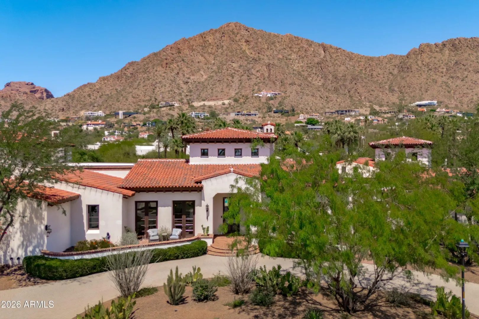 Set on over an acre at the base of Camelback Mountain, this Santa Barbara inspired estate is a rare expression of craftsmanship, scale, and design. Thoughtfully custom built with an emphasis on quality and detail, the home offers seamless indoor-outdoor living, expansive glass, and unobstructed mountain views that fill the interiors with natural light. Rich walnut flooring, custom millwork, and hand-crafted finishes define the living spaces, anchored by a chef's kitchen designed for elevated entertaining. The flexible floor plan includes multiple bedroom suites, a private guest retreat with separate living space, dedicated office and flex room with stunning views. Bathrooms feature artisan tile and refined natural stone, continuing the home's cohesive, high-end aesthetic.