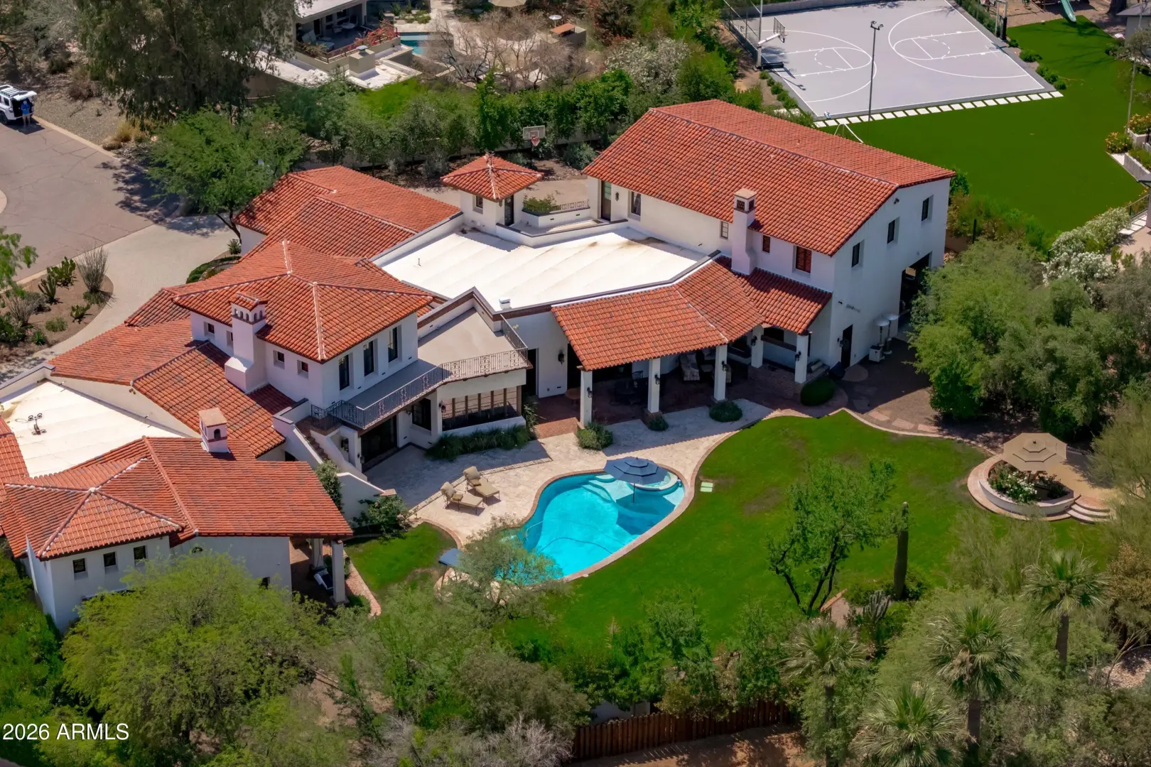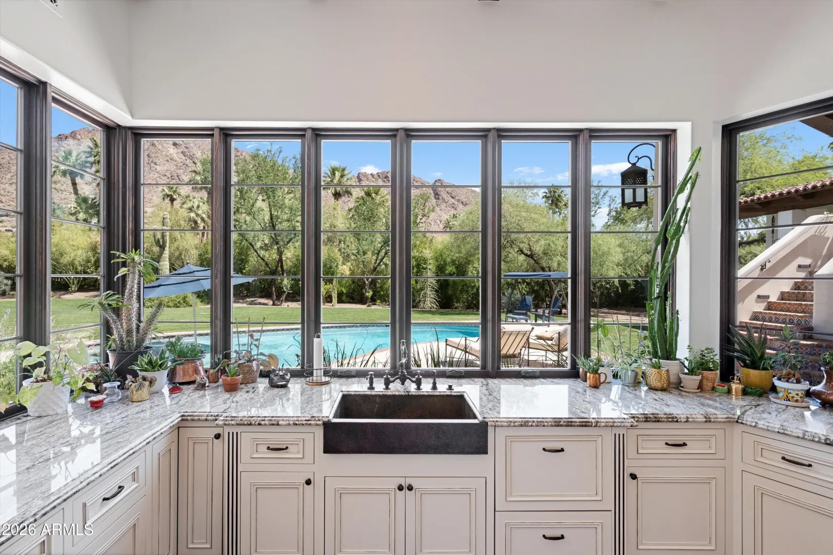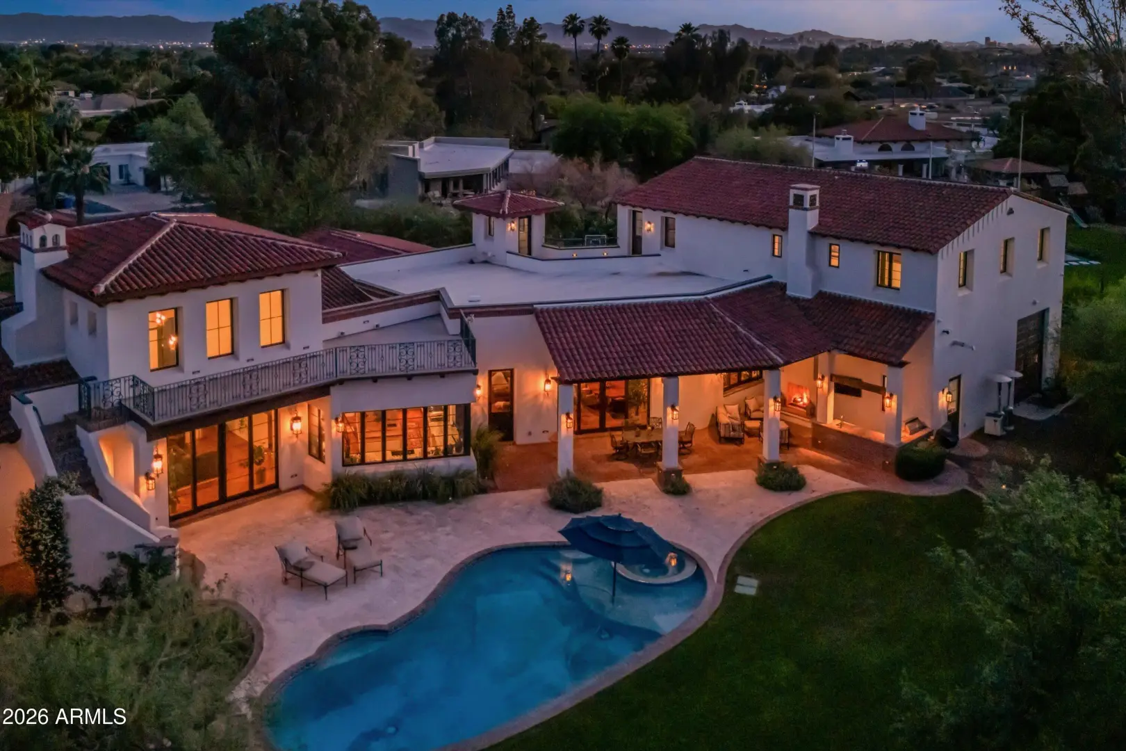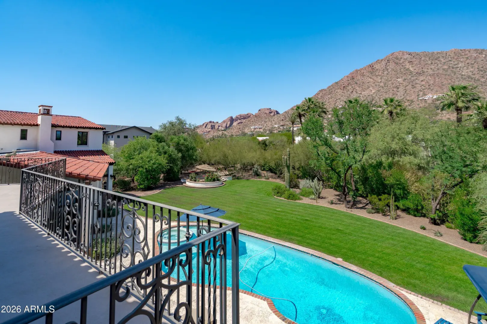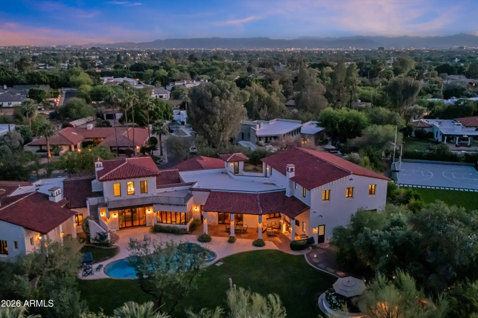 Set on over an acre at the base of Camelback Mountain, this Santa Barbara inspired estate is a rare expression of craftsmanship, scale, and design. Thoughtfully custom built with an emphasis on quality and detail, the home offers seamless indoor-outdoor living, expansive glass, and unobstructed mountain views that fill the interiors with natural light. Rich walnut flooring, custom millwork, and hand-crafted finishes define the living spaces, anchored by a chef's kitchen designed for elevated entertaining. The flexible floor plan includes multiple bedroom suites, a private guest retreat with separate living space, dedicated office and flex room with stunning views. Bathrooms feature artisan tile and refined natural stone, continuing the home's cohesive, high-end aesthetic.