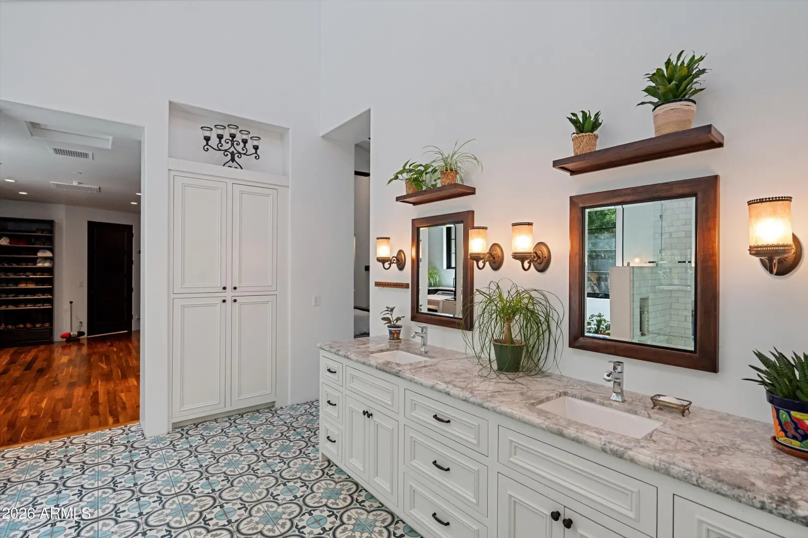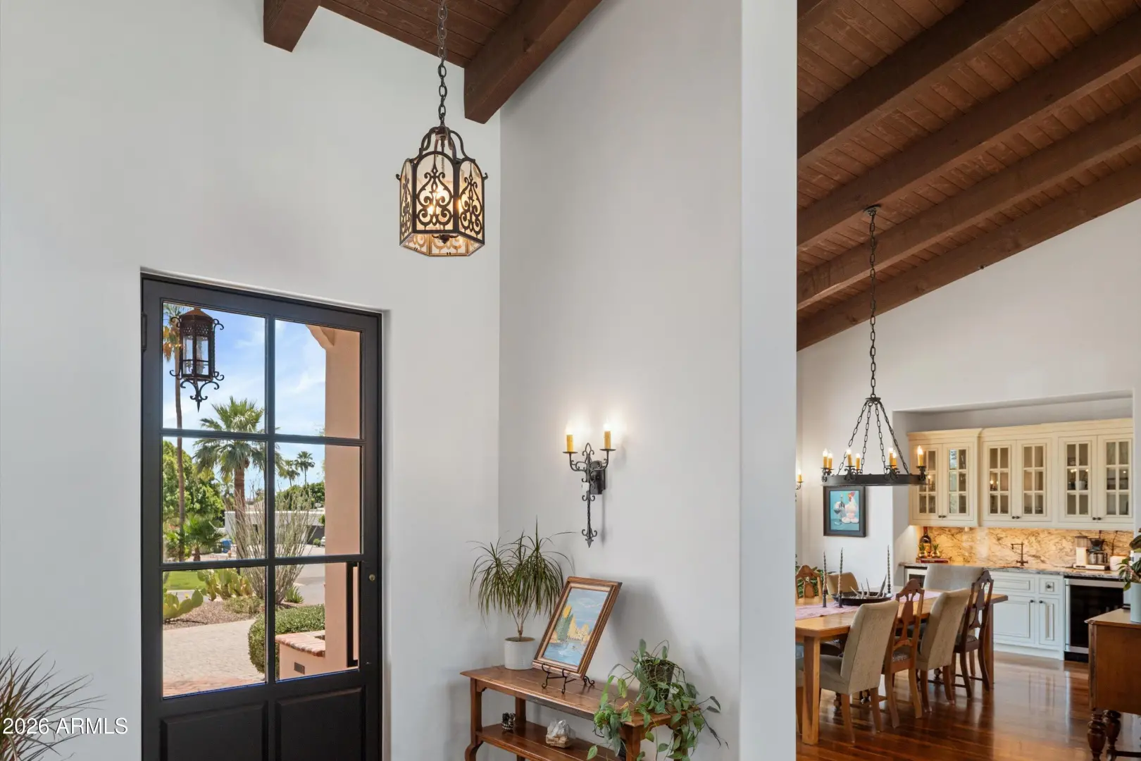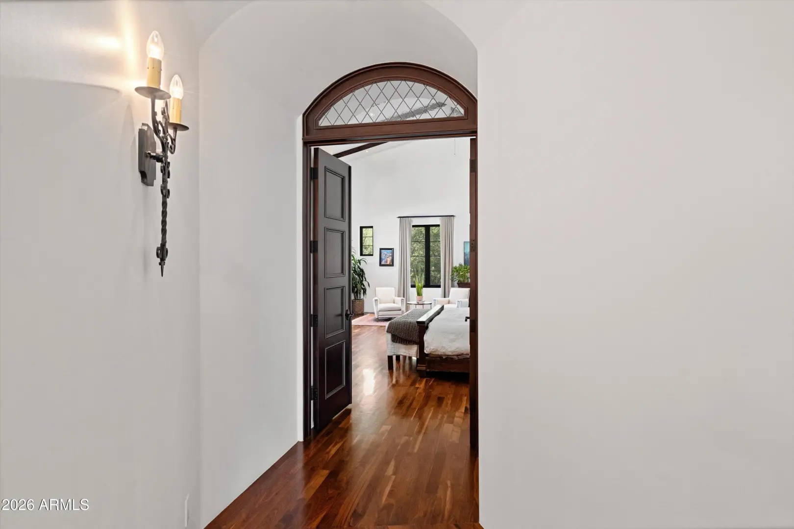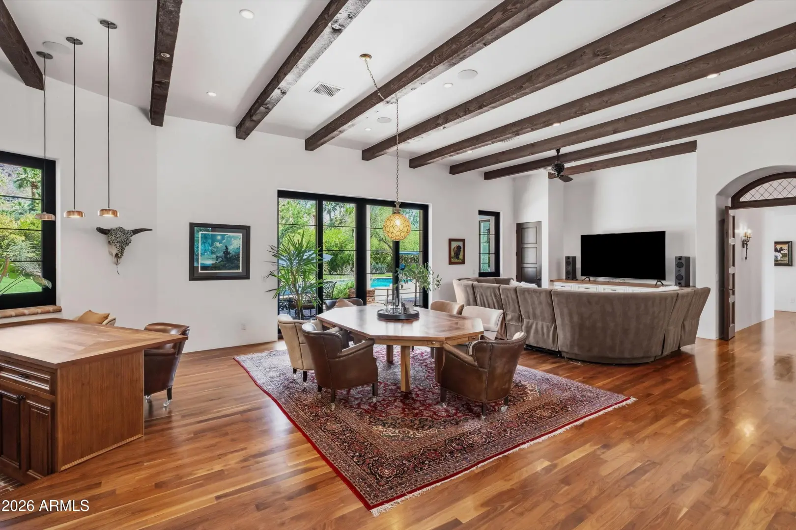Set on over an acre at the base of Camelback Mountain, this Santa Barbara inspired estate is a rare expression of craftsmanship, scale, and design. Thoughtfully custom built with an emphasis on quality and detail, the home offers seamless indoor-outdoor living, expansive glass, and unobstructed mountain views that fill the interiors with natural light. Rich walnut flooring, custom millwork, and hand-crafted finishes define the living spaces, anchored by a chef's kitchen designed for elevated entertaining. The flexible floor plan includes multiple bedroom suites, a private guest retreat with separate living space, dedicated office and flex room with stunning views. Bathrooms feature artisan tile and refined natural stone, continuing the home's cohesive, high-end aesthetic.