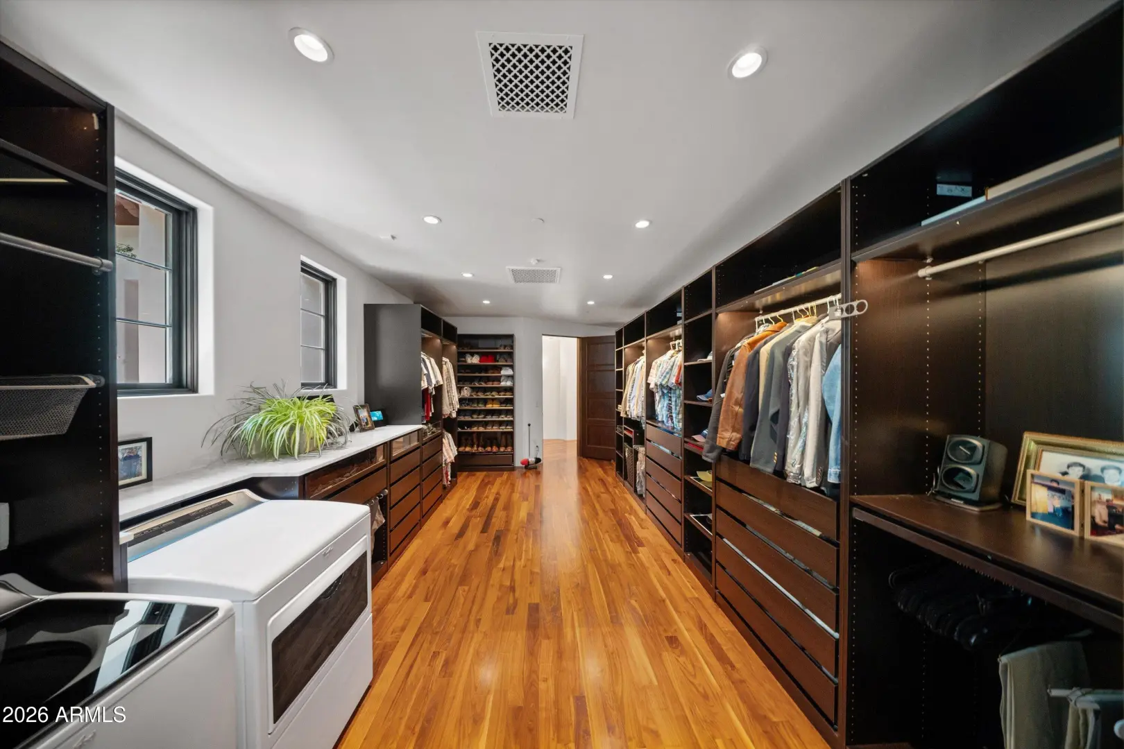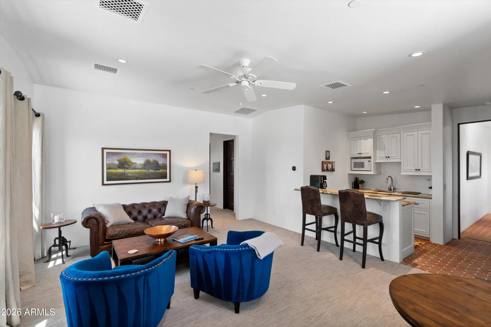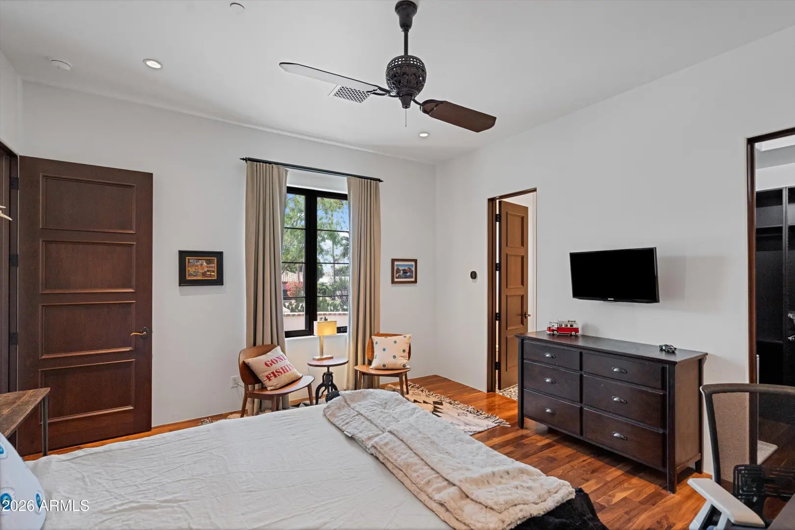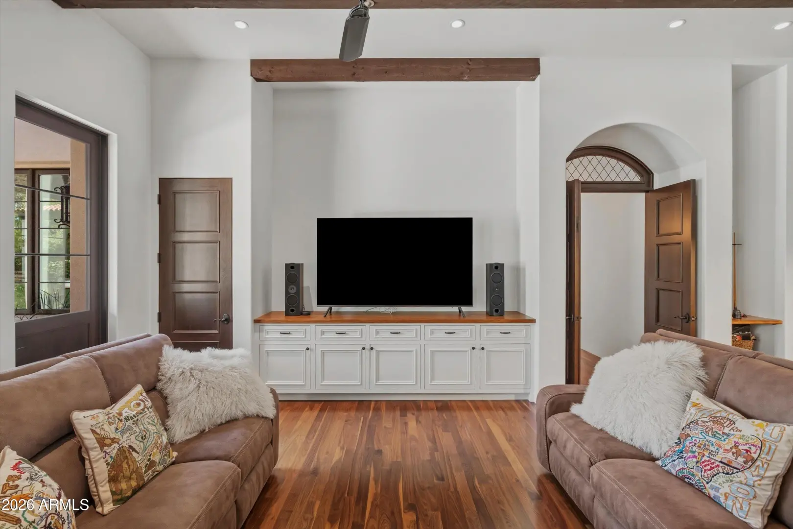 Set on over an acre at the base of Camelback Mountain, this Santa Barbara inspired estate is a rare expression of craftsmanship, scale, and design. Thoughtfully custom built with an emphasis on quality and detail, the home offers seamless indoor-outdoor living, expansive glass, and unobstructed mountain views that fill the interiors with natural light. Rich walnut flooring, custom millwork, and hand-crafted finishes define the living spaces, anchored by a chef's kitchen designed for elevated entertaining. The flexible floor plan includes multiple bedroom suites, a private guest retreat with separate living space, dedicated office and flex room with stunning views. Bathrooms feature artisan tile and refined natural stone, continuing the home's cohesive, high-end aesthetic.