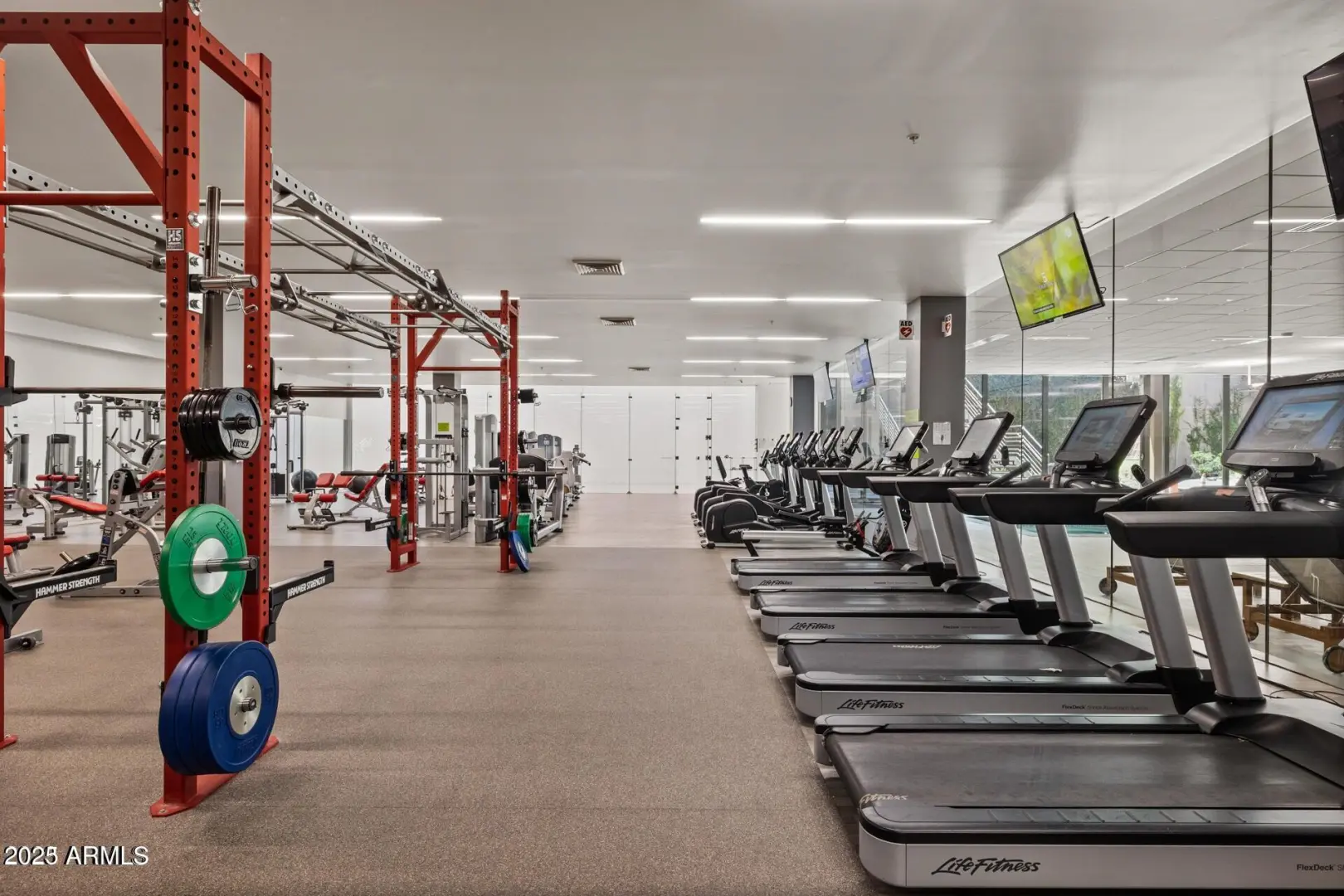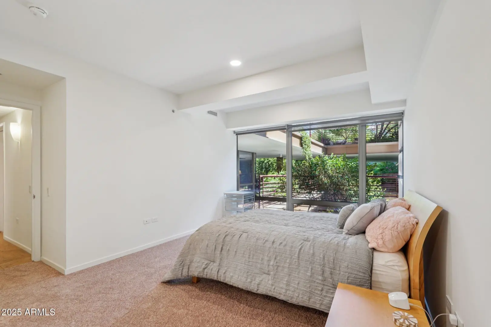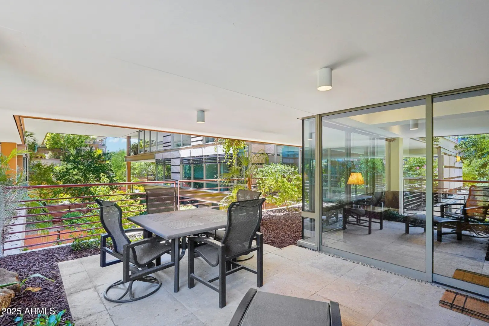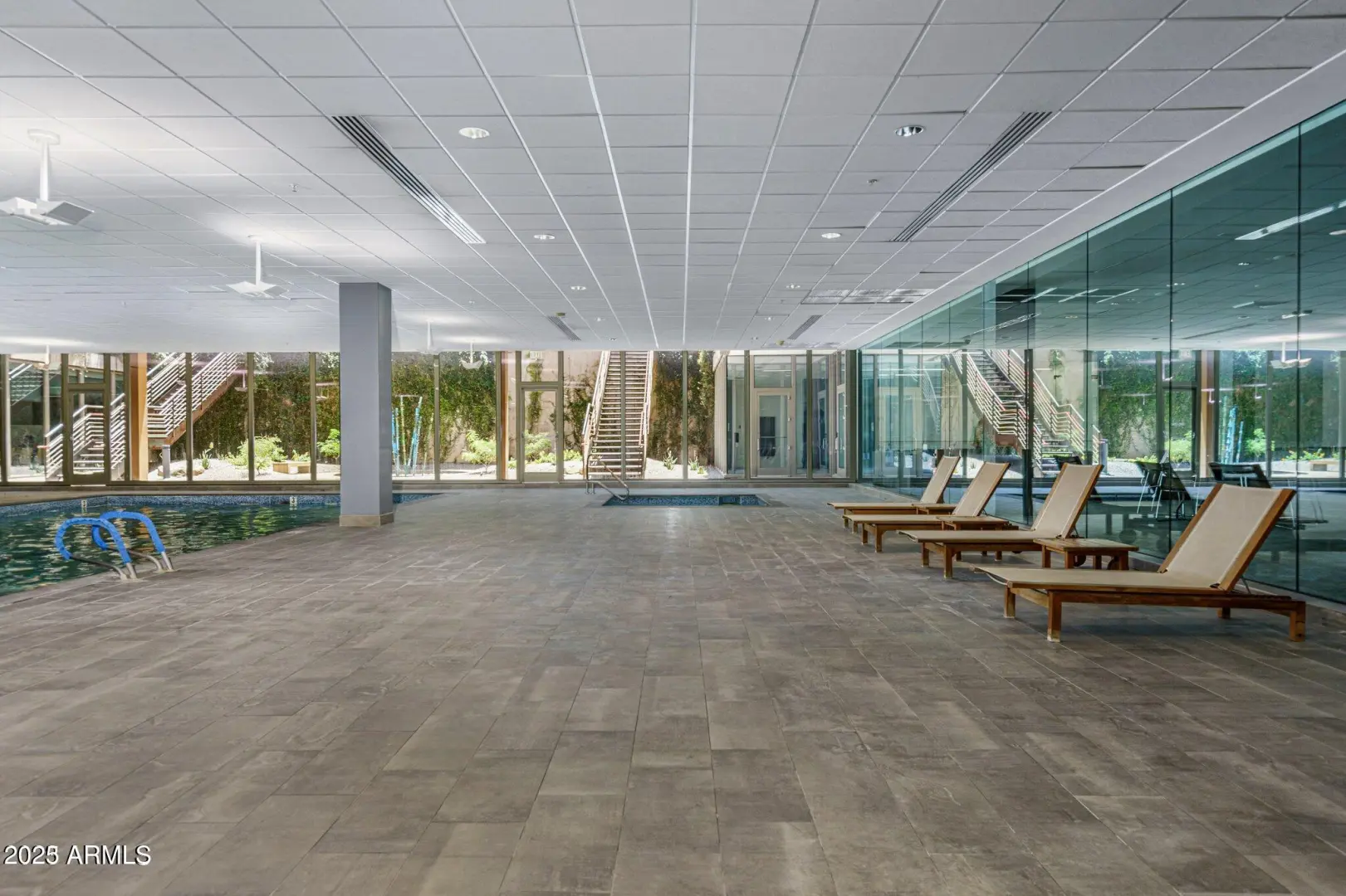 Welcome to this lovely interior facing Optima Camelview 2 bedroom 2 bath 1,323 sqft condominium. This wonderful property features serene pool and lush terrace views. The custom kitchen boasts granite countertops, a gas range with double ovens, wine fridge, and a breakfast bar that opens to the living and dining areas. There's also a built-in office nook with great storage. Floor-to-ceiling windows bring in lots of natural light and connect the space to the outdoors. Located in Optima Camelview, you'll have access to top-tier amenities: a 24,000 sq ft fitness center, indoor lap pool, spas, steam room, basketball and racquetball courts, plus two outdoor pools, walking paths, a dog park, and more. All just steps from Fashion Square, restaurants, movies, and nightlife.